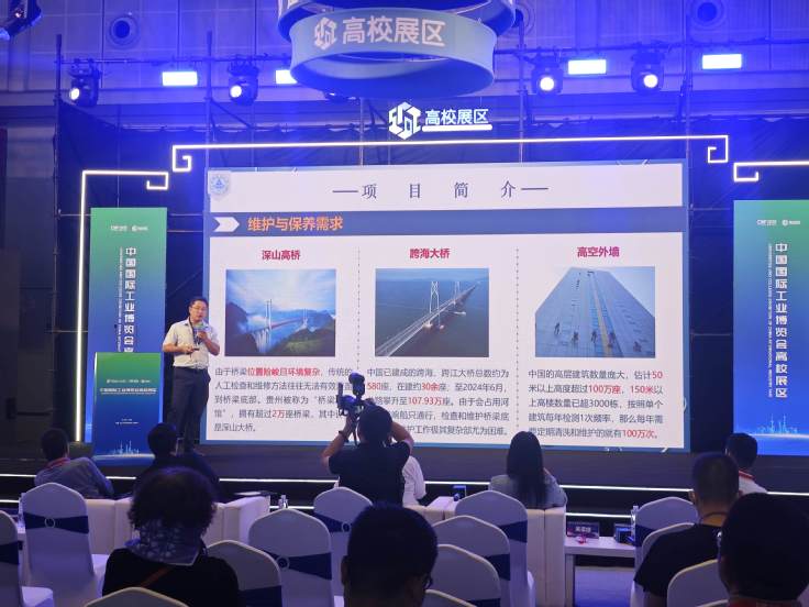 为推动科技成果与市场需求精准对接,深化产学研协同创新,展会设置了高校科技成果展区。高校科研成果展示区汇集了来自北京大学、复旦大学、上海交通大学、西北工业大学等68所高校精心遴选的580项科技创新成果。我校遴选高层建筑快速逃生救援装备和绳驱动无源抗干扰起重装备两项科技成果参展。